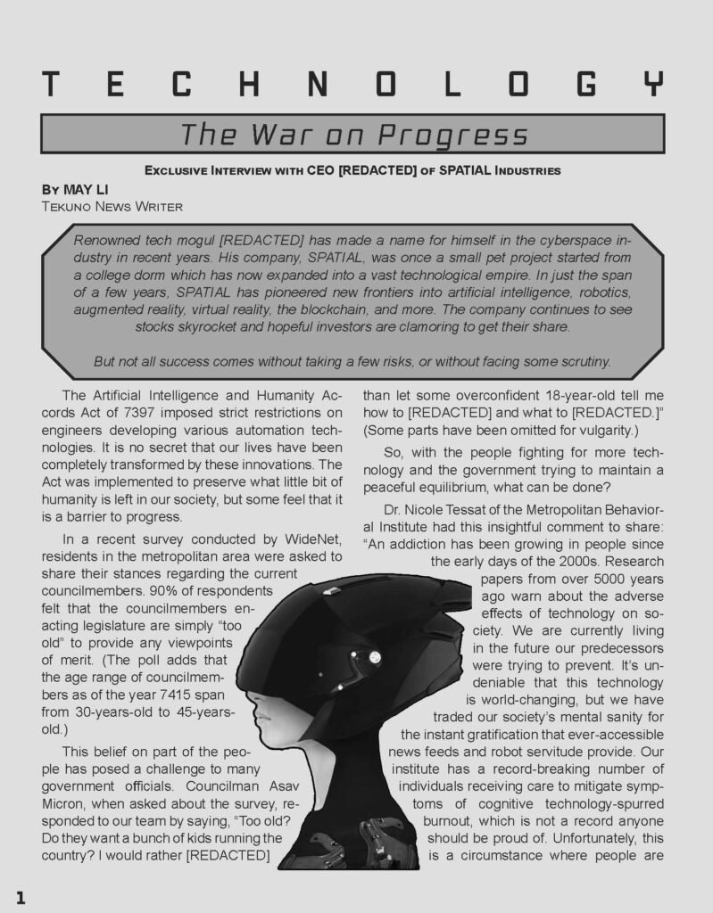 Written and designed entirely by me, this project served as a creative typography and composition study in Adobe InDesign. The spread includes a helmeted sci-fi portrait and minimalist layout designed to simulate a real magazine feature.